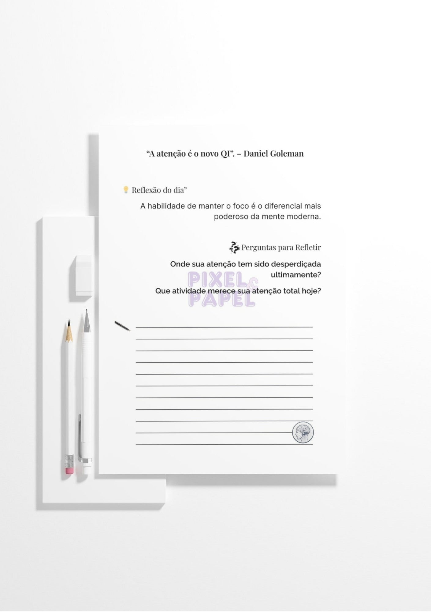 Cada página traz frases de grandes pensadores, psicólogos e neurocientistas, acompanhadas de breves reflexões e perguntas para desenvolver foco e consciência.