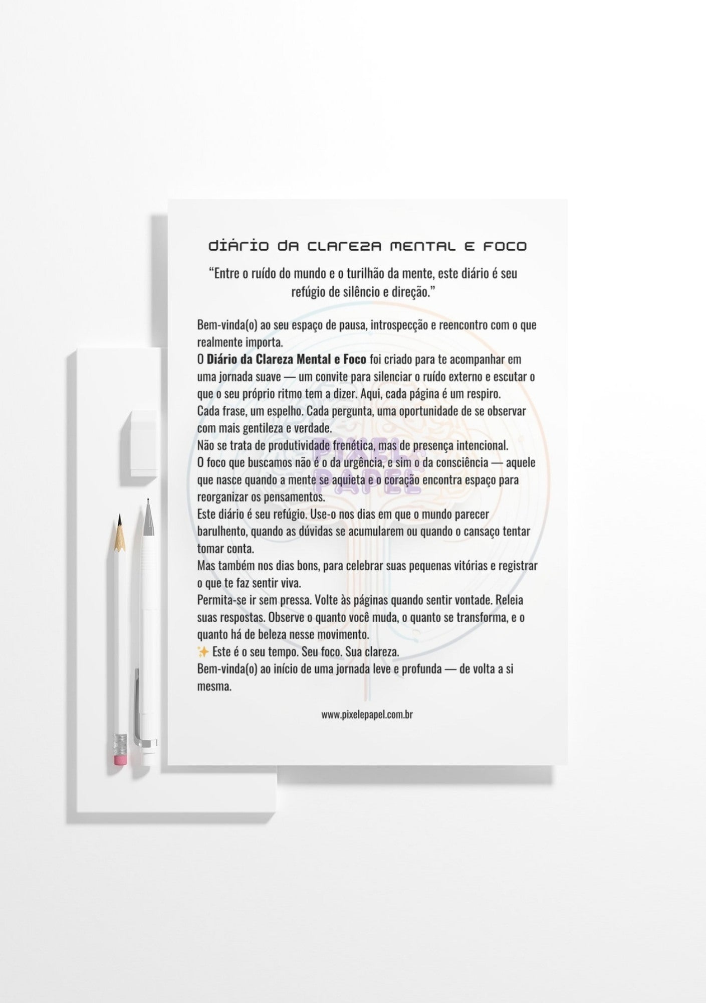 O Diário da Clareza Mental e Foco é um lembrete de que pensar com calma é um ato de coragem. Um companheiro diário para quem deseja simplificar, priorizar e viver com mais propósito.