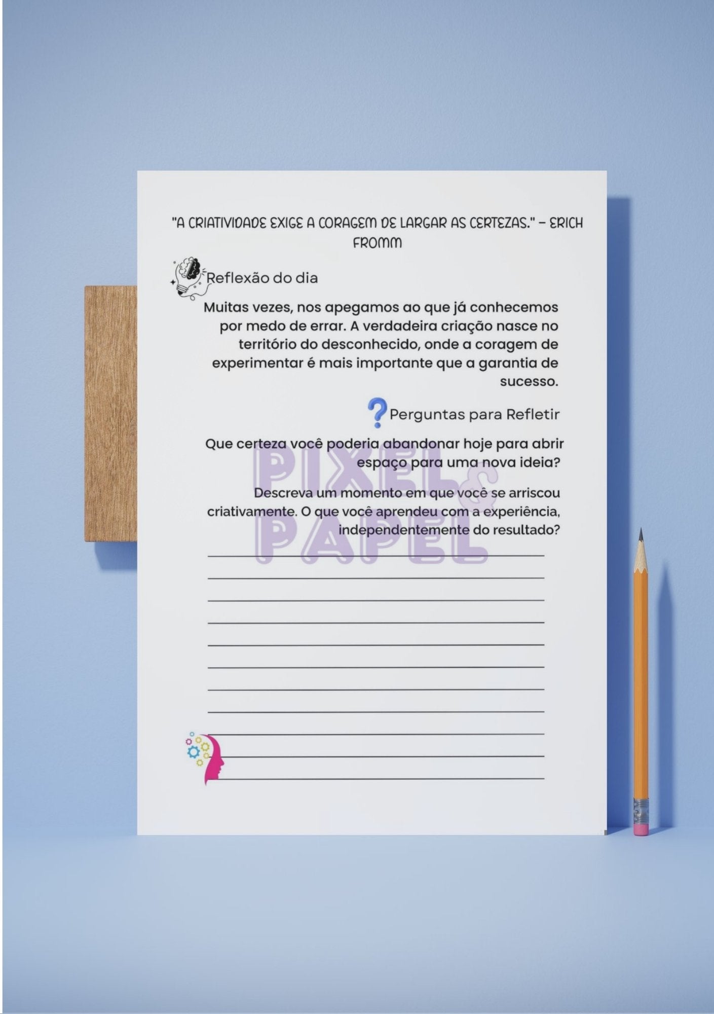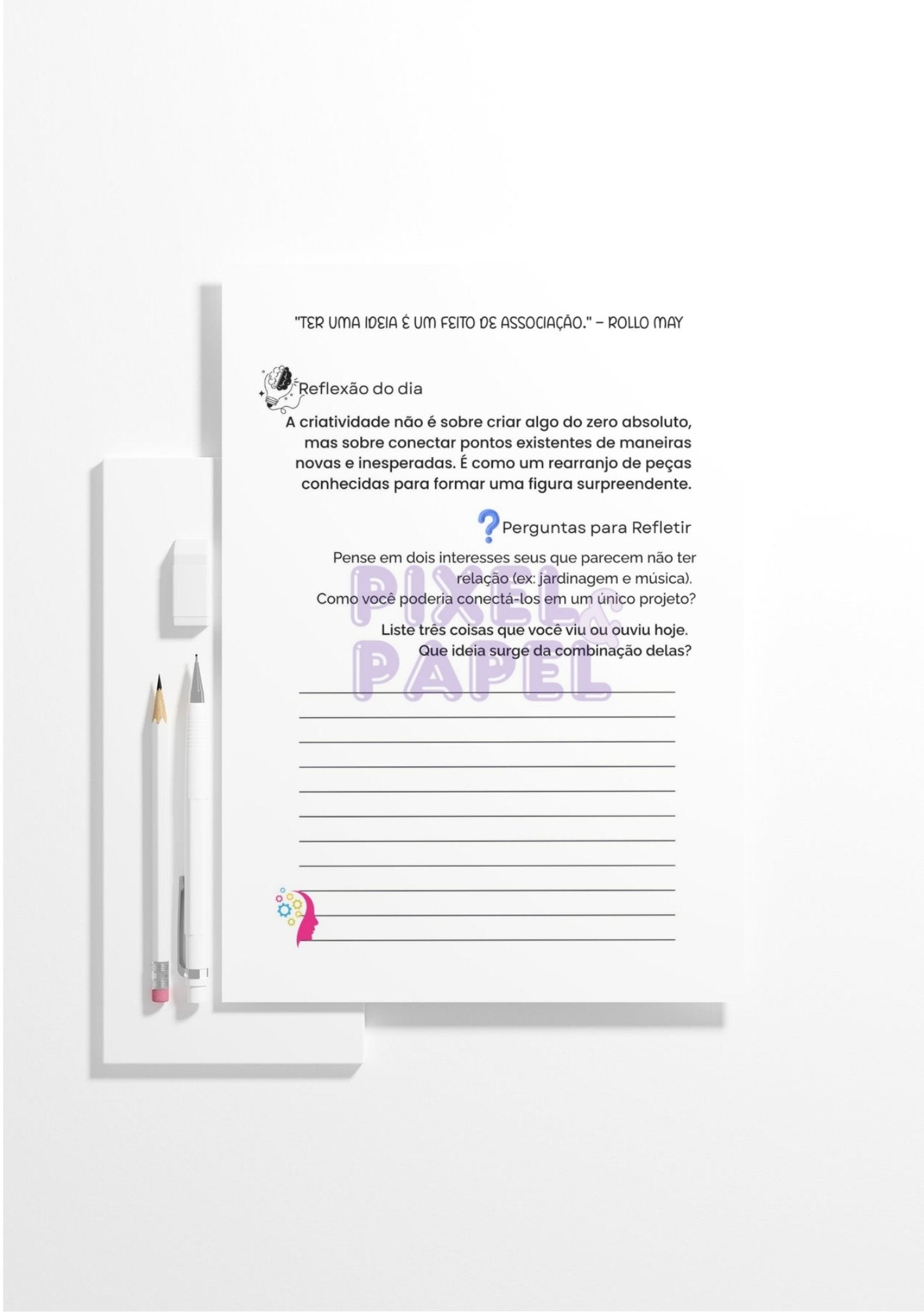 Espaço para Sua Voz- Cada reflexão é seguida por uma página inteira dedicada às suas anotações e pensamentos. O layout é limpo e inspirador, com um design visual consistente — a lâmpada formada por peças de quebra-cabeça — que reforça a mensagem central: a criatividade é a arte de conectar pontos de maneiras novas e surpreendentes.
