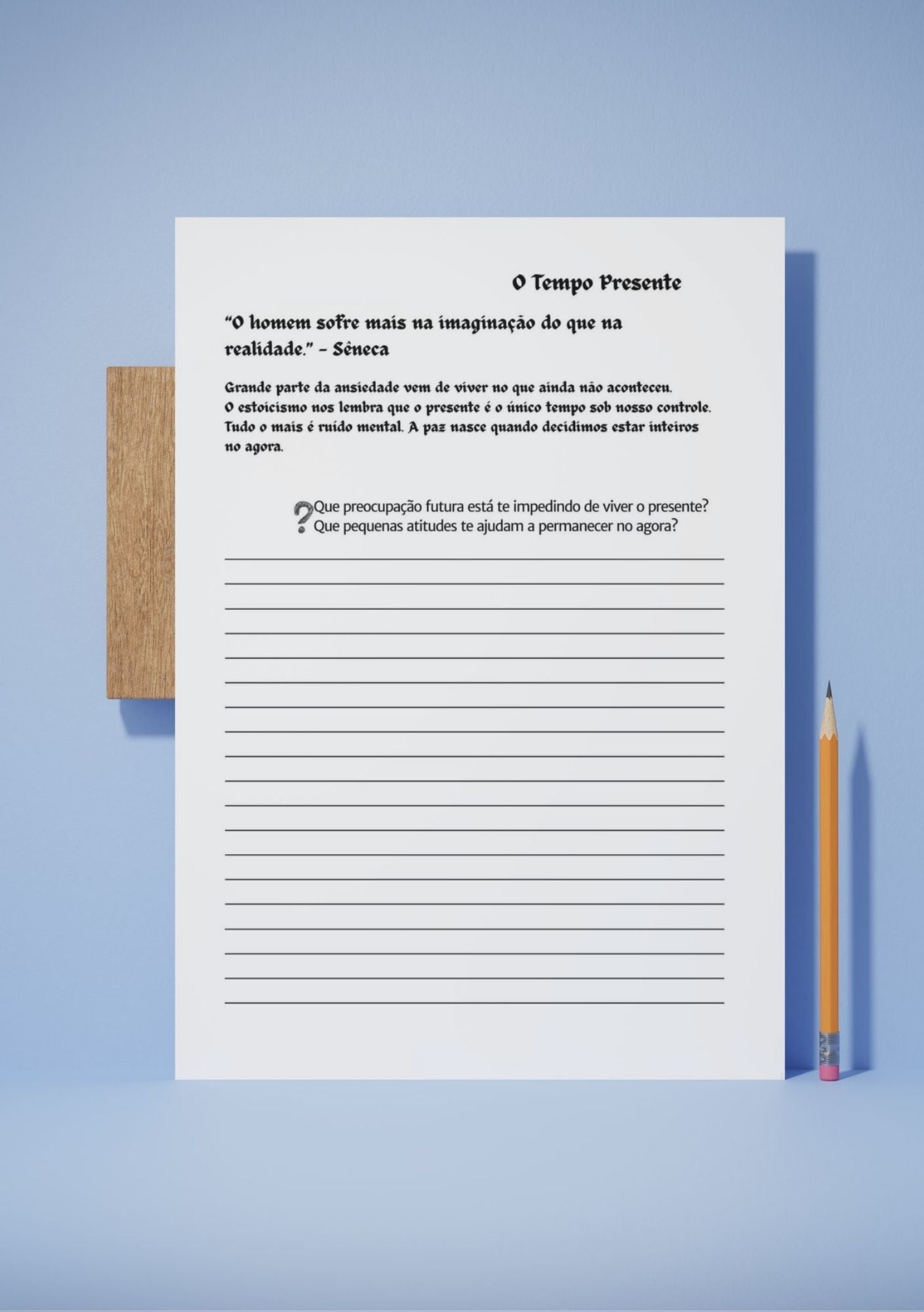 Inspirado na sabedoria atemporal do Estoicismo, este diário é um refúgio para a mente moderna. Ele foi desenhado não para lhe dar respostas prontas, mas para lhe fazer as perguntas certas, guiando você a encontrar seu próprio norte em meio ao caos.
